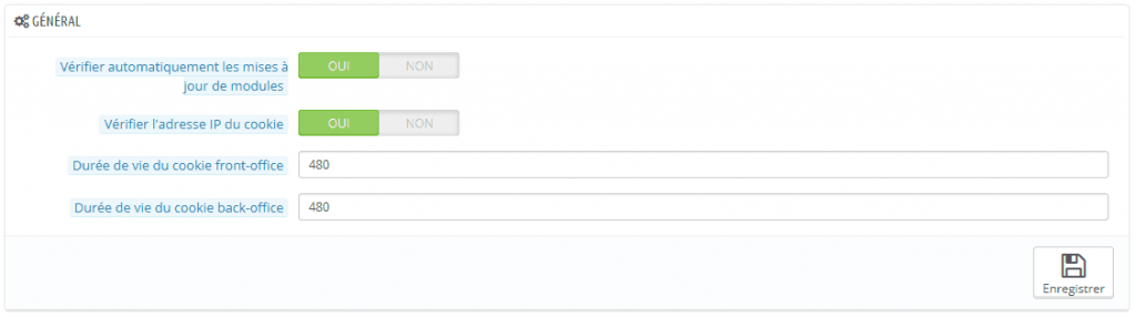 Vous allez dans Administration > Préférences. Vous pouvez activer l’option « Vérifier l’adresse IP sur le cookie ». De cette façon, Prestashop vérifiera si l’adresse IP des visiteurs correspond à celle du cookie de son navigateur. Cela permet de détecter les fraudeurs et de stopper des tentatives indésirables de connexion à la zone d’administration.