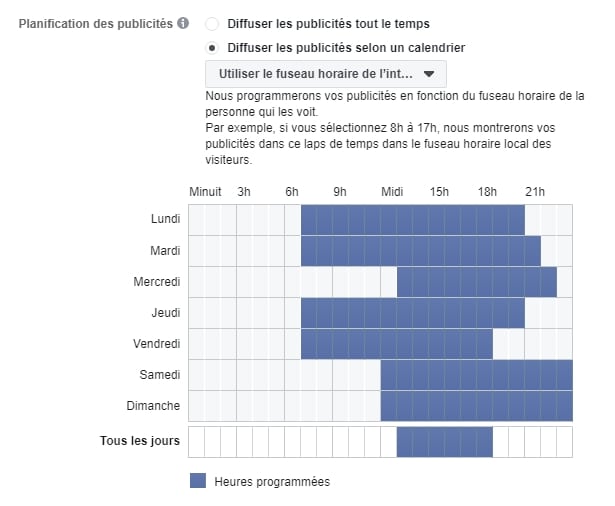 La clé pour obtenir de meilleurs résultats à moindre coût reste de programmer la diffusion de vos publicités à des moments rentables de la journée. Cela évite de gaspiller vos dépenses publicitaires alors que votre audience n’est pas réceptive (la nuit, par exemple) et de tirer profit d’un budget publicitaire limité.