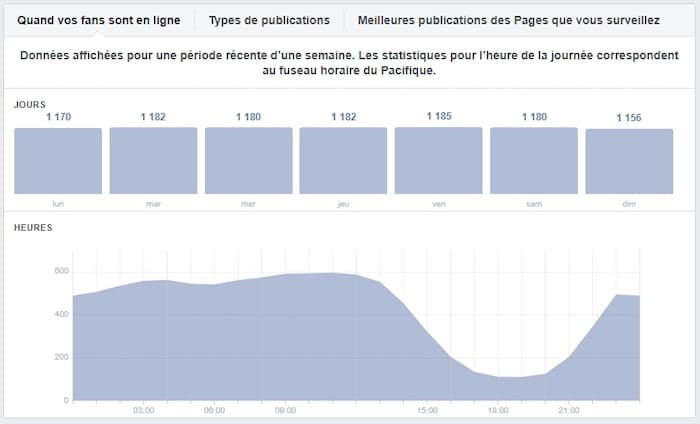 Vérifiez dans vos statistiques ! Vous disposez d’un graphique avec les jours et heures de connexion de vos abonnés. C’est une bonne base pour paramétrer les horaires de diffusion de vos campagnes Facebook Ads.